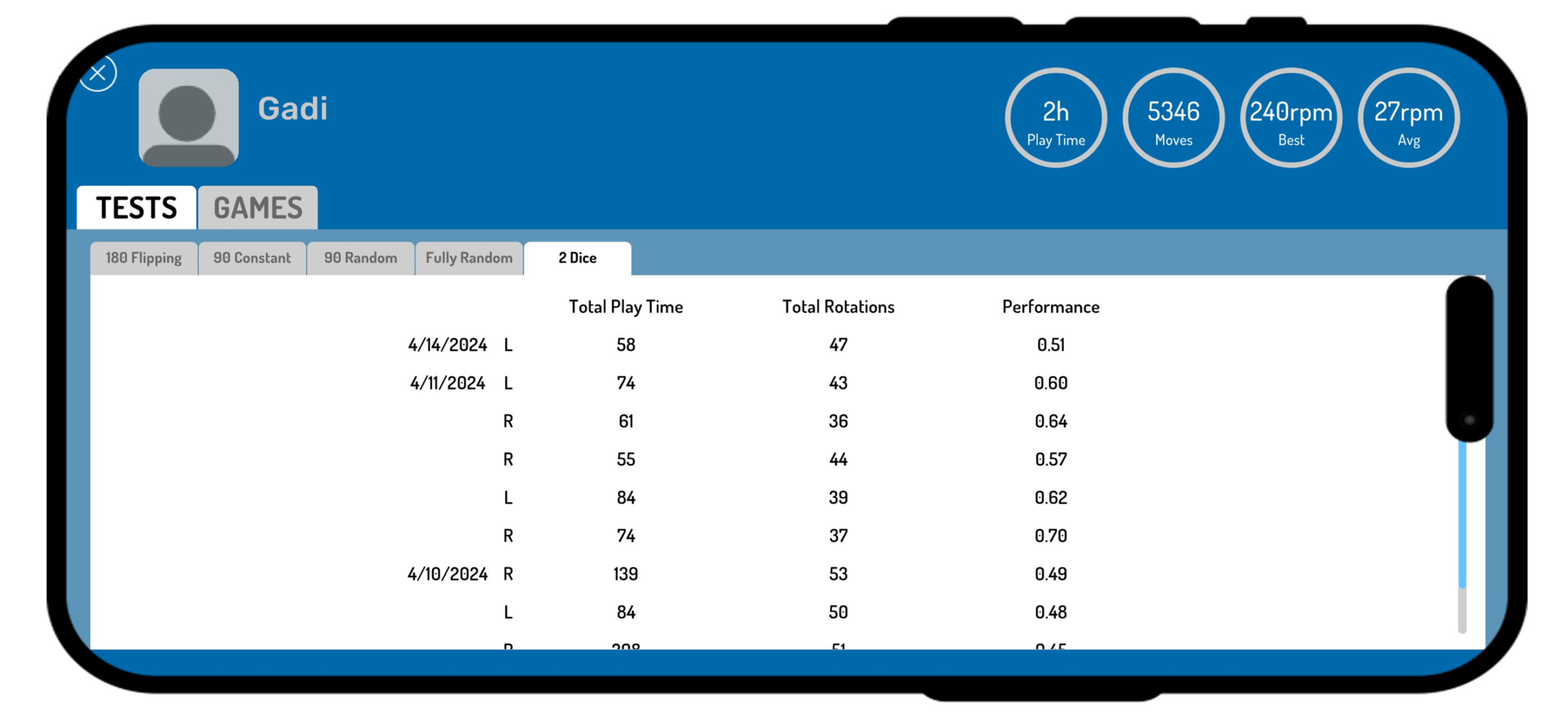 The system records key metrics, including training time, dice rotations, accuracy, speed, performance, cognitive score, and more. These insights provide a holistic view of the patient’s progress and are essential for tailoring effective therapy plans.